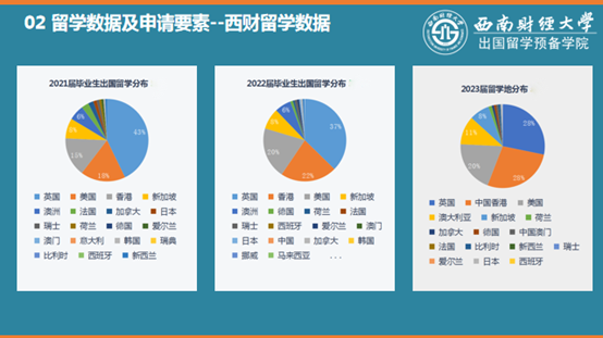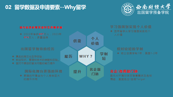 卢军老师还针对历年出国留学数据、西财学子出国留学数据和留学申请软硬件要素进行了详细的分析,并指出出国留学逐步成为许多学子提升学历、学习知识的更优选择。