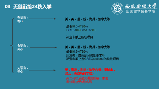 针对许多同学关心的,”考研成绩不是很理想,想要给考研加一个双保险,但又不想gap一年,怎么样才能无缝衔接申请2024年秋季入学?“这个问题,卢军老师也从当前是否有语言和GRE/GMAT成绩的各种情况进行了详细的分析,贴心的给大家梳理了英美澳港新未截止院校清单,为同学们分享了满满的干货。