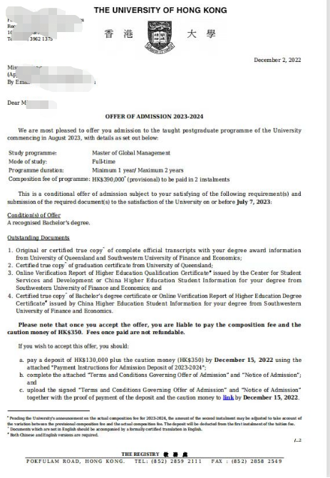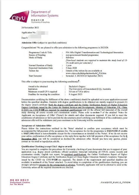 合作大学——世界排名前50的昆士兰大学,2022年本科毕业,目前已收到香港大学、香港城市大学在内的多份offer。