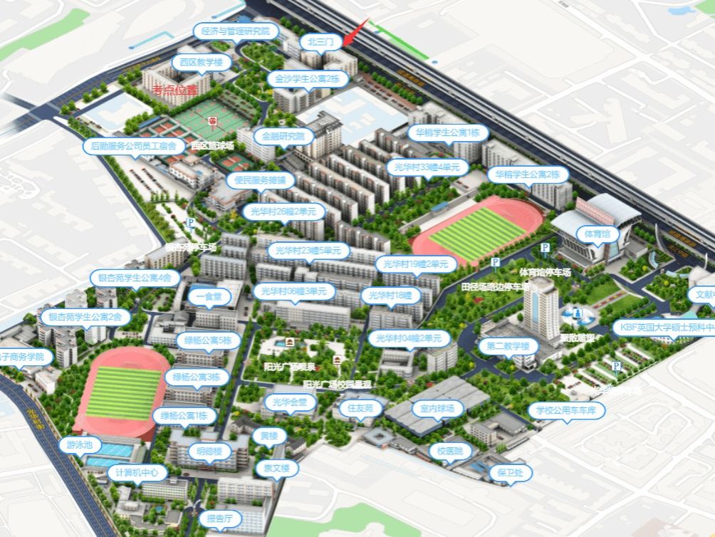 光华校区西区教学楼。光华校区北三门为考生出入指定校门,北三门位于成都市青羊区清江中路57号,地铁四号线文化宫站B出口前方约10米,金沙公交枢纽站对面。光华校区其它校门暂不允许考生进出。