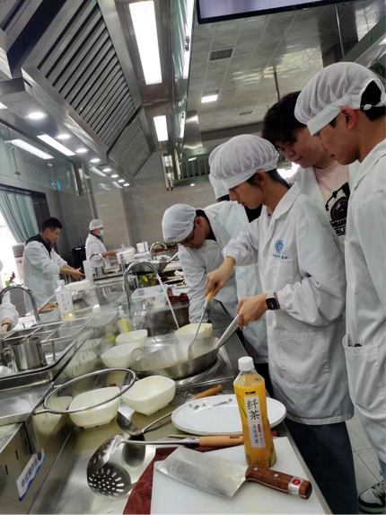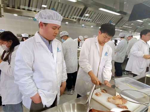理论学习后,同学们更换了专业的厨师服,进行了手部清洁,进入实操间并领取原材料。